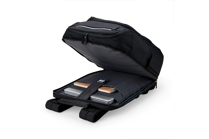 Alças com bolsos integrados para suporte de óculos e cartões.